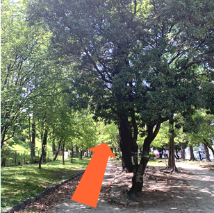 横断歩道を渡り、真っ直ぐ。気持ちいいので公園の中を歩くのがオススメ。右手の歩道を歩いてもよし。