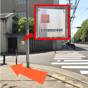 最初の交差点の横断歩道は渡らず左折する。角には建築事務所あり。