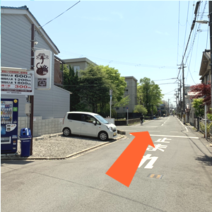 突き当たり左側に奥まった駐車場あり。そのまま道なりに進む。